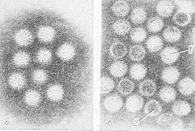 Рис. 1. Элекгронограммы вирионов ротавируса человека в препаратах фекальной суспензии больного гастроэнтеритом (негативное контрастирование): а — полные вирионы; б — полные (1) и неполные (2) вирионы; х 50 000.