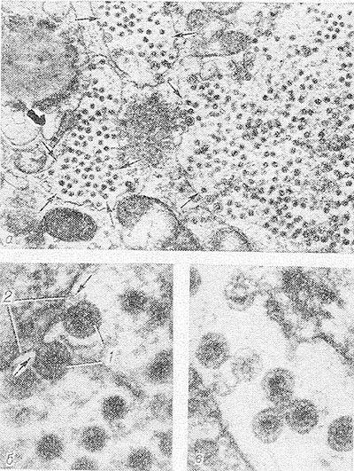 Рис. 2. Электронограммы отдельных стадий морфогенеза ротавируса человека в культуре клеток почек обезьян (5-й пассаж): а — цитоплазматическое включение фиброзного типа, многочисленные вирионы в полостях эндоплазматической ретикулума (указано стрелками), х 20 0 00; б — отпочковывание (указано стрелками) вргрионов (1) от мембраны эндоплазматического ретикулума (2), х 50 000; в — отпочковавшиеся внеклеточно расположенные вирионы, х 50 000.