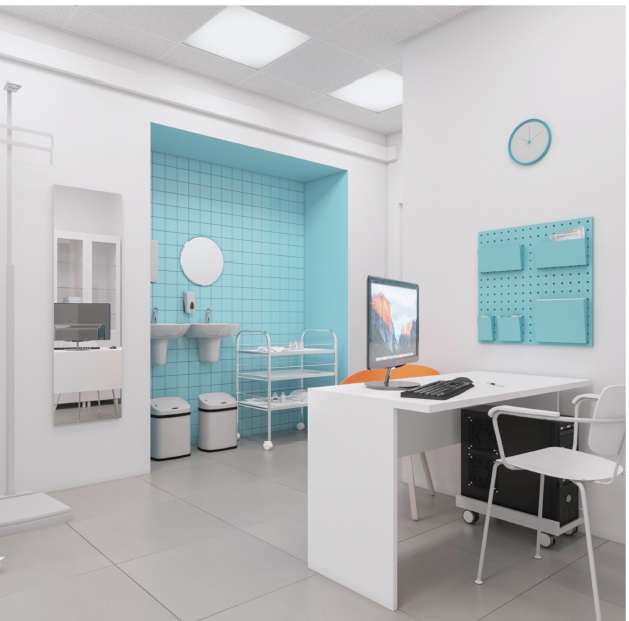 Деление на зоны осуществляется с помощью цветовых ниш: в светло-сером пространстве медицинского офиса появляется несколько колор-блоков в фирменных цветах компании, которые упорядочивают пространство и подсказывают посетителю, как ему перемещаться. Так, например, визит посетителя в офис начинается с надевания бахил в нише или на скамейке, затем он двигается к тёмно-голубой рецепции, перемещается в зону ожидания с оранжевой нишей, после этого — в медицинский кабинет.
