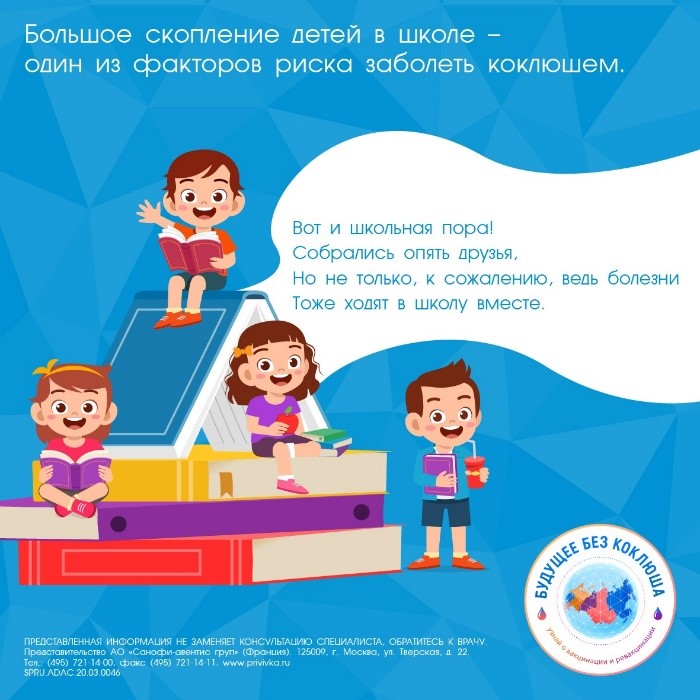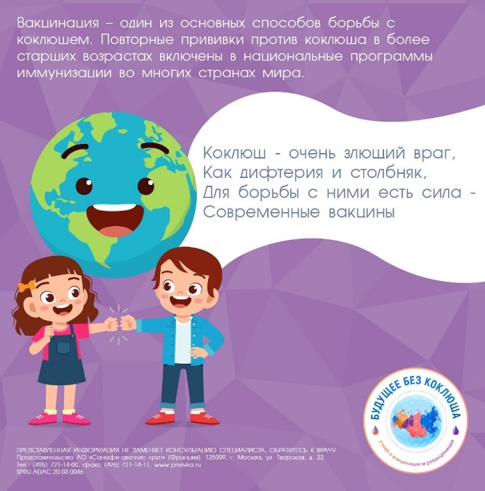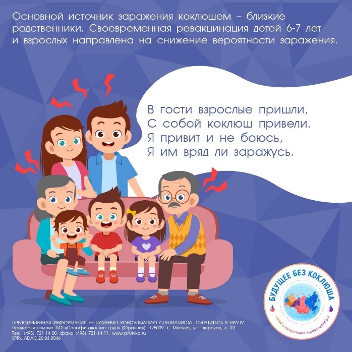 «Всем известно, что коклюш – это инфекционное заболевание с поражением верхних дыхательных путей, для которого характерны приступы длительного тяжелого кашля. Но не все знают, что поствакцинальный иммунитет к коклюшу угасает в среднем в течение 5-8 лет после последней прививки в 18 мес[6]. В этой связи ревакцинация, которая уже давно включена в список обязательных во многих странах мира, очень важна. Проводить ревакцинации рекомендуется в 6-7 лет, 14 лет и далее каждые 10 лет», — сказала Оксана Таланова, Руководитель медицинского отдела Санофи Пастер по странам Евразии.
