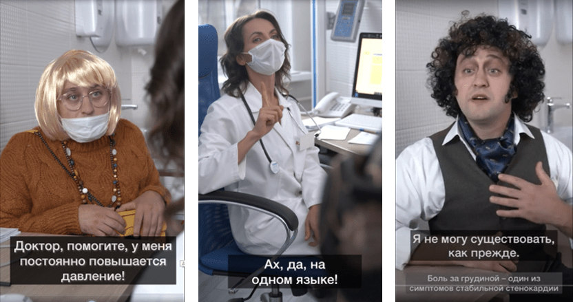 Следующий раздел «Язык ИБС» открывает ролик в другом жанре – юмористическом. Это зарисовка из практики молодого терапевта: изобретательный молодой врач назначает терапию для профилактики приступов стабильной стенокардии и старается найти общий язык со своими пациентами.