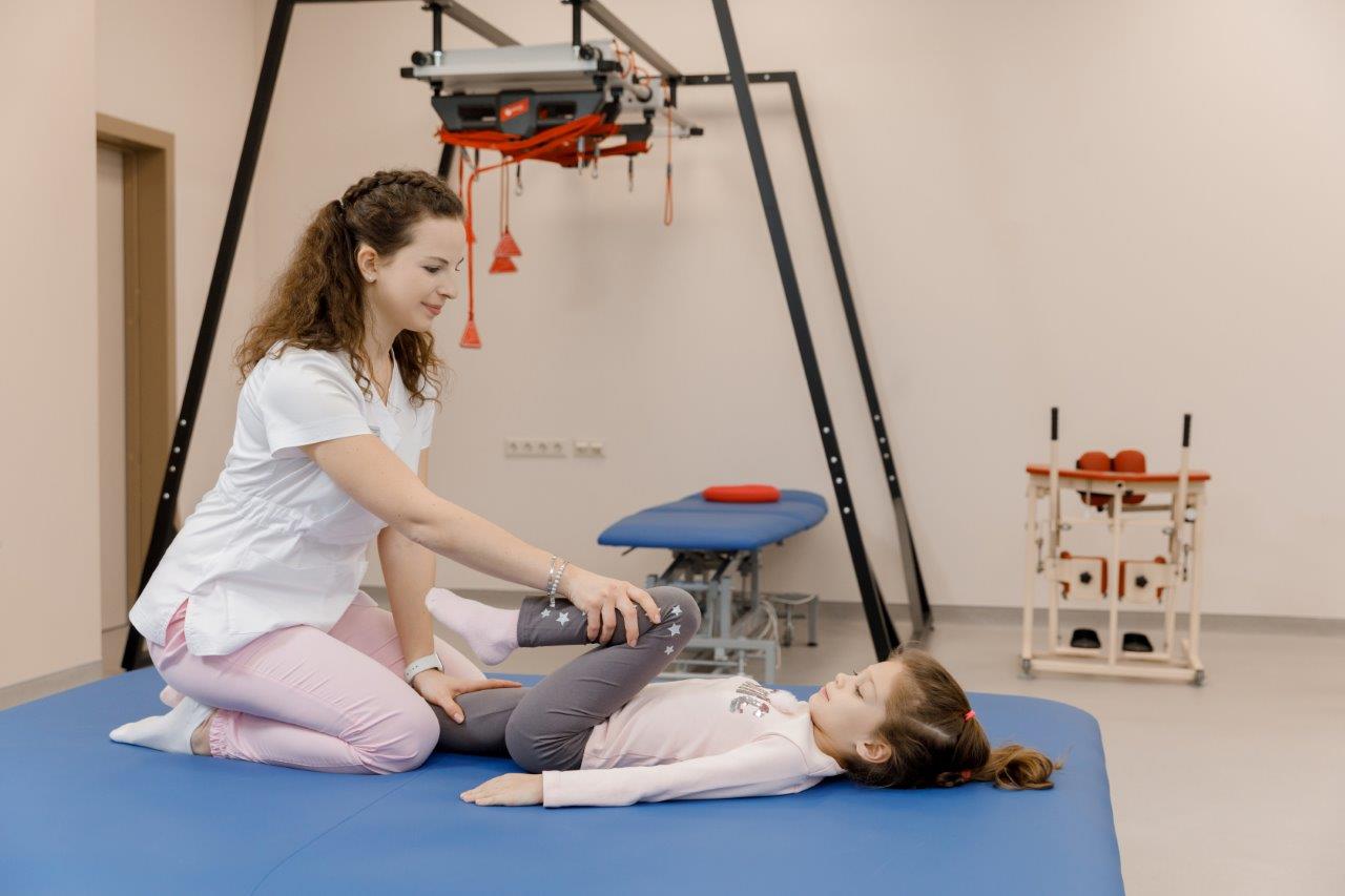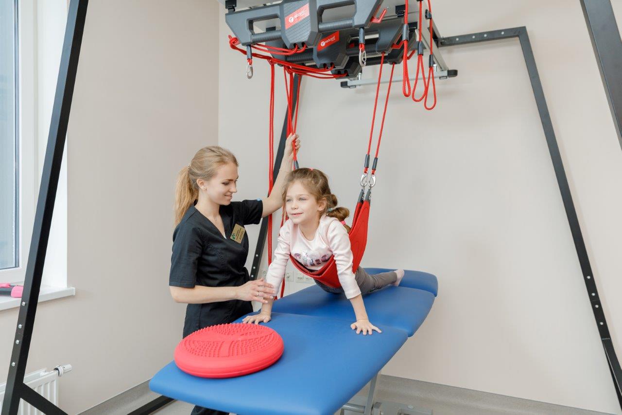 Зал лечебной гимнастики реабилитационного центра на Мичуринском проспекте разделен на несколько зон – для одновременного проведения здесь занятий со взрослыми и детьми, пациентами с поражениями опорно-двигательного аппарата, сколиозами, плоскостопием и иными патологиями. Помещение оснащено роботической реабилитационной техникой швейцарской компании «Хакума» — для восстановления мелкой моторики и диагностики, которая входит в процесс лечения. Кроме того, в зале имеются: зона для эрготерапии детей и взрослых, оснащение для ЛФК, o реабилитационно-циклическая дорожка (с минимальной скоростью 1,5 км/ч), мобильная система разгрузки тела и фиксации для занятий пациента при невозможности удерживать вертикальное положение, тренажер-лестница для тренировки ходьбы вверх и вниз с разной высотой ступеней, брусья для занятий в вертикальном положении.