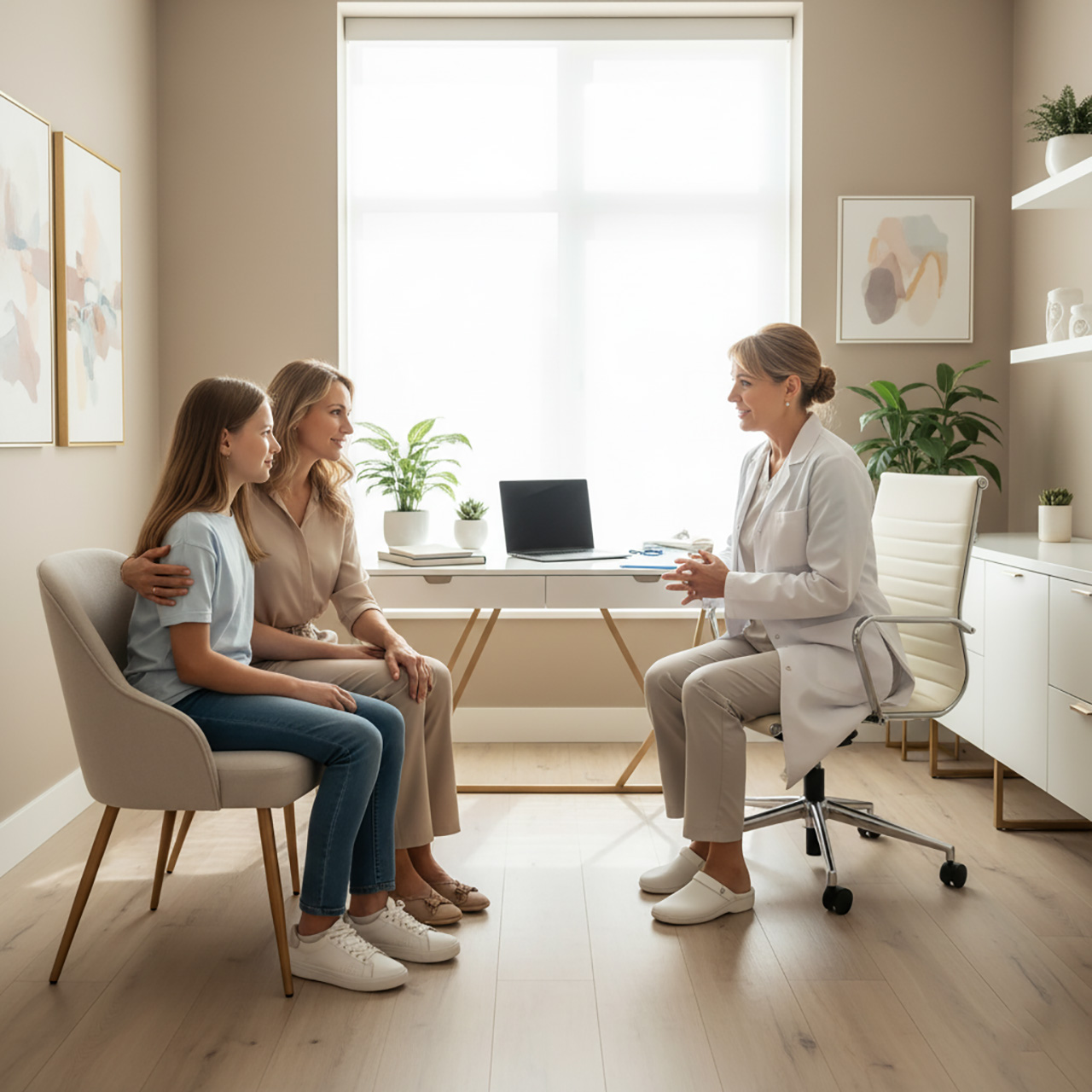До 15 лет — по закону мама может присутствовать на приёме, но главное — спросить у самой девочки, как ей комфортнее. Иногда рядом с мамой подростку будет спокойнее. А в каких-то случаях важнее дать пространство, чтобы поговорить наедине. Совет мамам: сказать честно: «Ты можешь сама выбрать — я буду с тобой или подожду за дверью. Главное, чтобы ты чувствовала себя в безопасности»