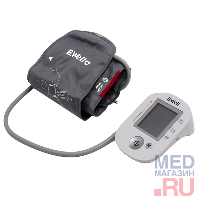 - Манжета в комплекте: Универсальная конусная манжета B.Well для обхвата плеча 22 — 42 см.