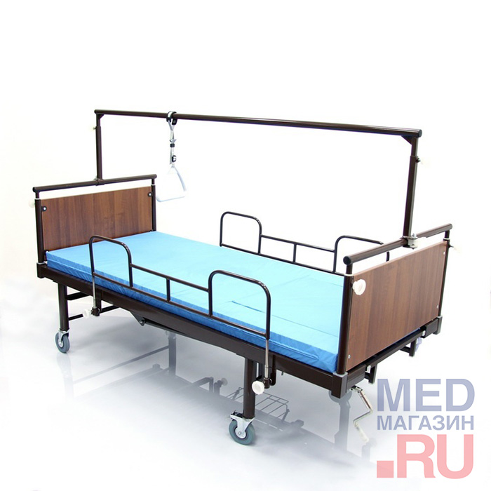 - Съемные регулируемые по высоте боковые ограждения из стальных труб позволяют больному подтягиваться и вставать, используя их в качестве опоры.