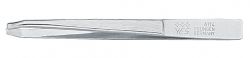 Пинцет изготовлен из высокоуглеродистой стали и предназначен для коррекции бровей, удаления волос и заноз.