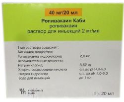 — блокада отдельных нервов и инфильтрационная анестезия.Внутрисуставная инъекция при артроскопии коленного сустава.В концентрации 2 мг/1 мл Ропивакаин Каби применяют по следующим показаниям: