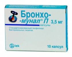 Активные вещества: лиофилизированный лизат бактерий: Streptococcus pneumoniae, Haemophilus influenzae, Klebsiella pneumoniae, Klebsiella ozaenae, Staphylococcus aureus, Streptococcus viridans, Streptococcus pyogenes, Moraxella catarrhalis – 3,5 мг