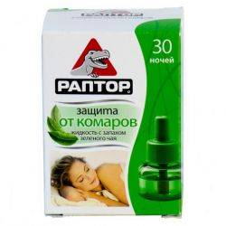 Универсальный нагревающийся прибор раптор предназначен как для использования пластин, так и для жидких наполнителей .На продолжении всей ночи специальный состав жидкого наполнителя обеспечит вам надежную защиту от комаров и приятный сон. Ликвид совершенно лишен запаха .Нужно снять колпачок с флакона, вставить стержень в нагревающийся. прибор и плотно закрутить. Поверните прибор так, чтобы флакон был расположен вертикально, и включите прибор в розетку. Через 10-15 минут после включения прибор начнет действовать. В течении 1-2 часов будет полное уничтожение комаров.