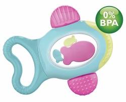 Этот прорезыватель выполнен в форме удлиненного кольца из безопасного материала, поэтому малыш сам сможет держать этот аксессуар. Также внимание малыша привлечет окраска и дизайн – рыбка в середине, которой плавают рыбки меньшего размера.. Малыш не только будет грызть эту рыбку-прорезыватель, но и играть, развивая при этом моторику, координацию рук и ног, пальчики.