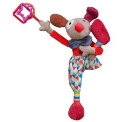 Красочная приятная мышь из серии Magic Circus от Ebulobo для детей от 3-х месяцев. Это клоун по имени Альфред. Он имеет шуршащие уши, на правой ноге колокольчик, пищащую левую ногу, пластиковые кольца на правой руке. Если вы потянете его носик, то у него завибрирует голова.