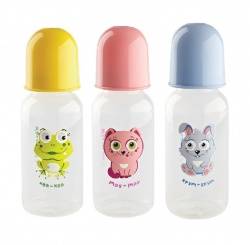 КУРНОСИКИ БУТЫЛОЧКА С ЛАТЕКСНОЙ СОСКОЙ имеет классическую форму и понятную мерную шкалу, соответствующую объему. Удобна в использовании и уходе. В комплект входят круглая латексная соска и герметичный колпачок, предохраняющий содержимое от проливания. Не разогревайте бутылочку с навинченной соской, тщательно перемешивайте содержимое бутылочки после разогрева, температура питания не должна превышать 40 градусов. Бутылочки из пищевого пластика легки, не подвержены появлению микротрещин, из которых могут выпасть осколки, их можно кипятить и стерилизовать. Латекс – прочный гипоаллергенный материал, который не вступает в химическую реакцию со слюной, хорошо стерилизуется, не теряет форму и не впитывает запахи.