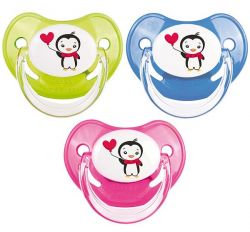Яркая и стильная пустышка разработана в уникальном авторском дизайне и украшена изображением пингвинчика с сердцем.