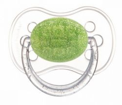Соска пустышки имеет классическую круглую форму. Благодаря специальным отверстиям на нагубнике она отлично вентилируется, что предотвращает риск возникнования покраснений и раздражения на нежной коже малыша. Кольцо пустышки светится в темноте, благодаря чему пустышку легко найти ночью, не боясь разбудить малыша.