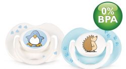 Плоские симметричные соски пустышек Philips Avent каплевидной формы учитывают строение и естественное развитие неба, зубов и десен малыша и гарантируют комфорт, даже если пустышка переворачивается во рту.