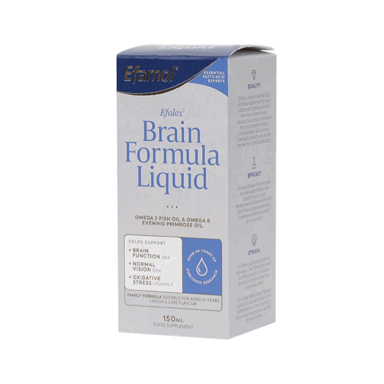 Уникальный состав продукта, включающий жиры и витамины, способствует нормализации целого ряда систем жизнедеятельности организма: зрения, памяти, гормонального фона. Препарат рекомендован детям от 3-х лет и взрослым. Основой всех продуктов Efamol являются питательные вещества Омега-3, Омега-6, необходимые для нормального функционирования клеток человеческого организма. Для производства биодобавок используются высококачественный рыбий жир, масло примулы вечерней, витамины. Сироп Efamol Efalex Brain Formula — это пищевая добавка, содержащая в себе расширенное сочетание Омега 3 и Омега 6 полиненасыщенных жирных кислот, которые помогают организму нормализовать работу головного мозга, зрительной функции, а также повышают концентрацию внимания.