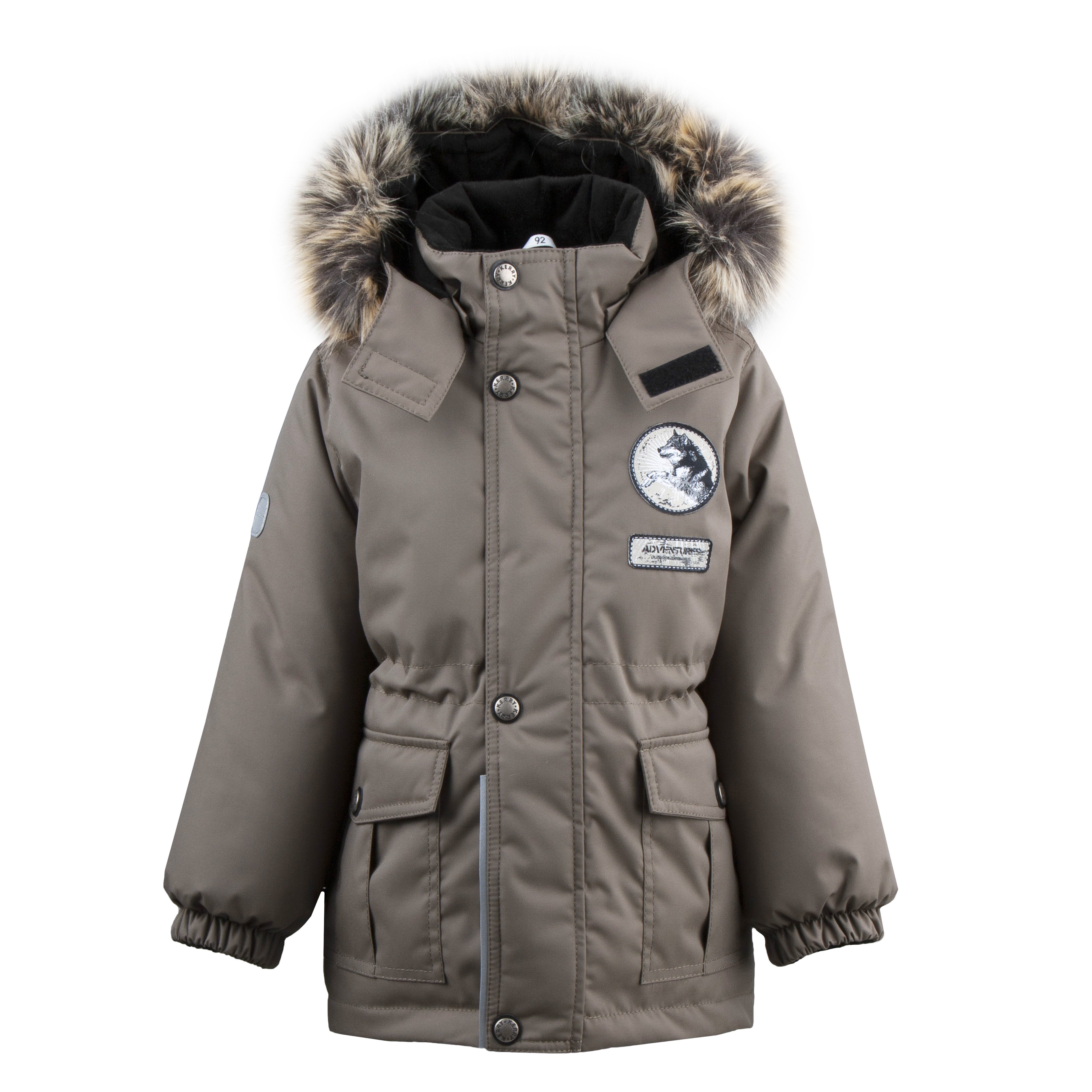 Куртка однотонная для мальчиков с тематическим декором. Украшена аппликациями на рукаве и груди в виде эмблемы с волком. Капюшон с опушкой из искусственного меха и на флисовой подкладке для дополнительного тепла. Рукава оснащены резинками для более плотного прилегания. Накладные карманы с клапанами застегиваются на кнопки.