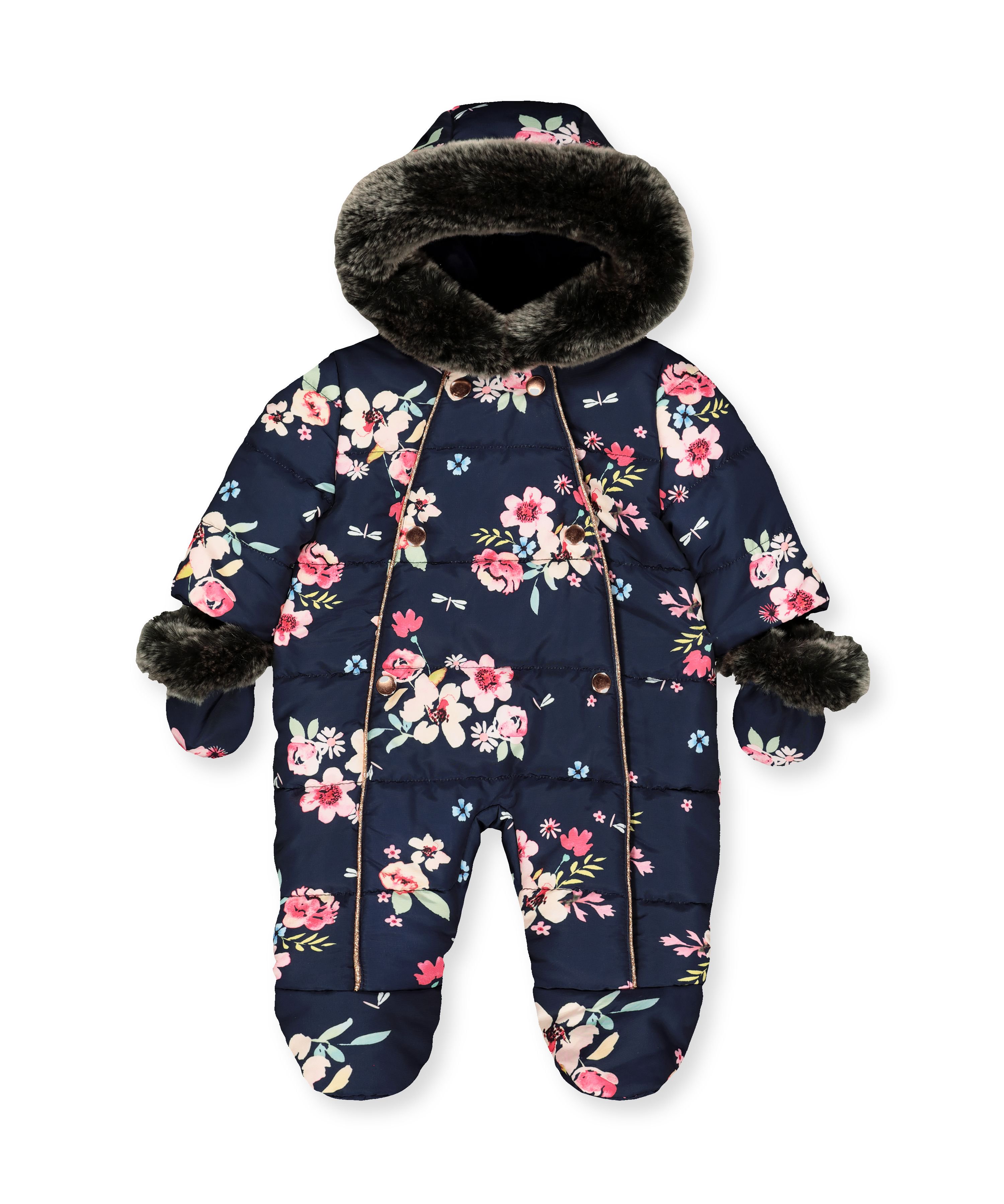 Утепленный комбинезон на флисовой подкладке. Имеет капюшон с меховой опушкой, съемные рукавички и ботиночки. Украшен ярким цветочным орнаментом.
