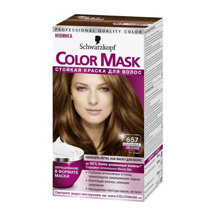 Color Mask 657 Каштановый медный первая краска для волос в формате маски! Color Mask обладает уникальной текстурой маски. Именно новый уникальный формат позволяет достичь глубокого сияющего цвета и ослепительного блеска на много недель. При этом краска полностью закрашивает седину! Благодаря потрясающей кремовой текстуре краска легко наносится руками. Вы ощутите новое измерение в окрашивании – оно создано для быстрого и равномерного самостоятельного нанесения.