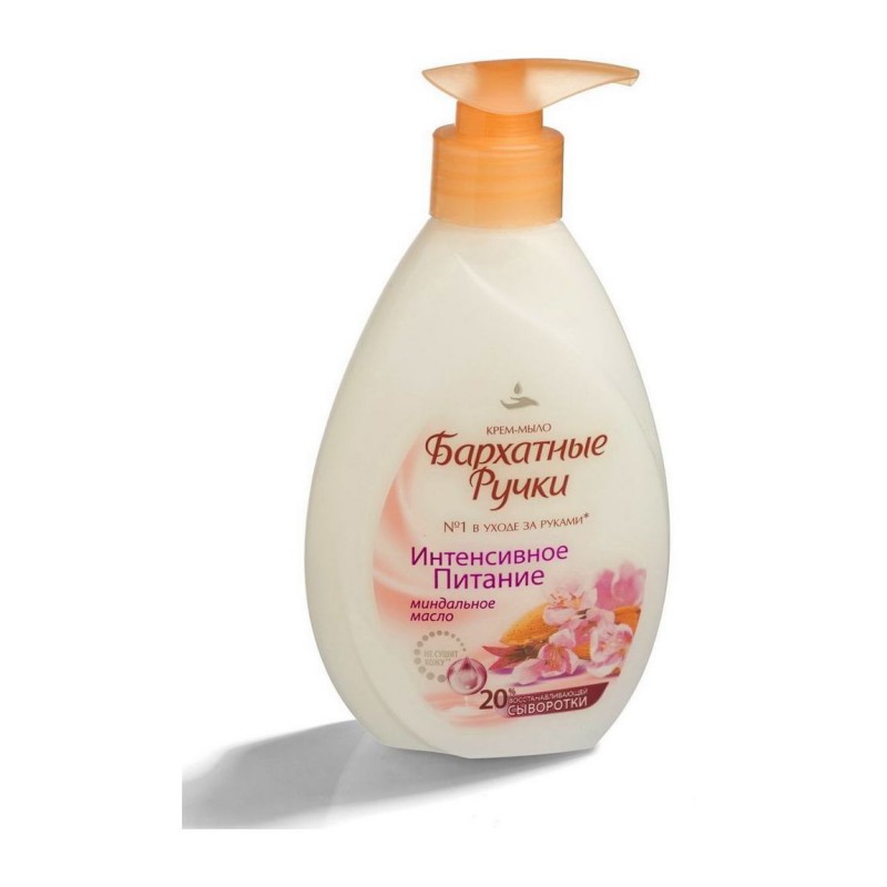 Жидкое крем-мыло Бархатные ручки “”Интенсивное питание”” миндальное масло, жидкое 240мл. Крем-масло не только мягко очищает, но и бережно ухаживает за кожей рук, благодаря наличию комплекса кремовых компонентов, который эффективно воздействует на кожу рук: способствует питанию и смягчению, придает коже гладкость. Предотвращает появление сухости и стянутости после мытья. В состав формулы входят: натуральное миндальное масло, протеины молока, витамины А и Е, провитамин В5.