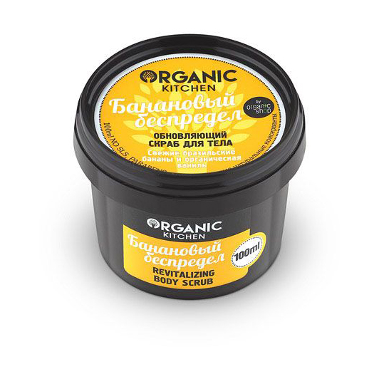 Органик Шоп Китчен Скраб обновляющий для тела””Банановый беспредел”” 100мл. Свежие бразильские бананы питают и увлажняют кожу, делая ее упругой и эластичной. Органическая ваниль стимулирует процесс обновления кожи и смягчает.