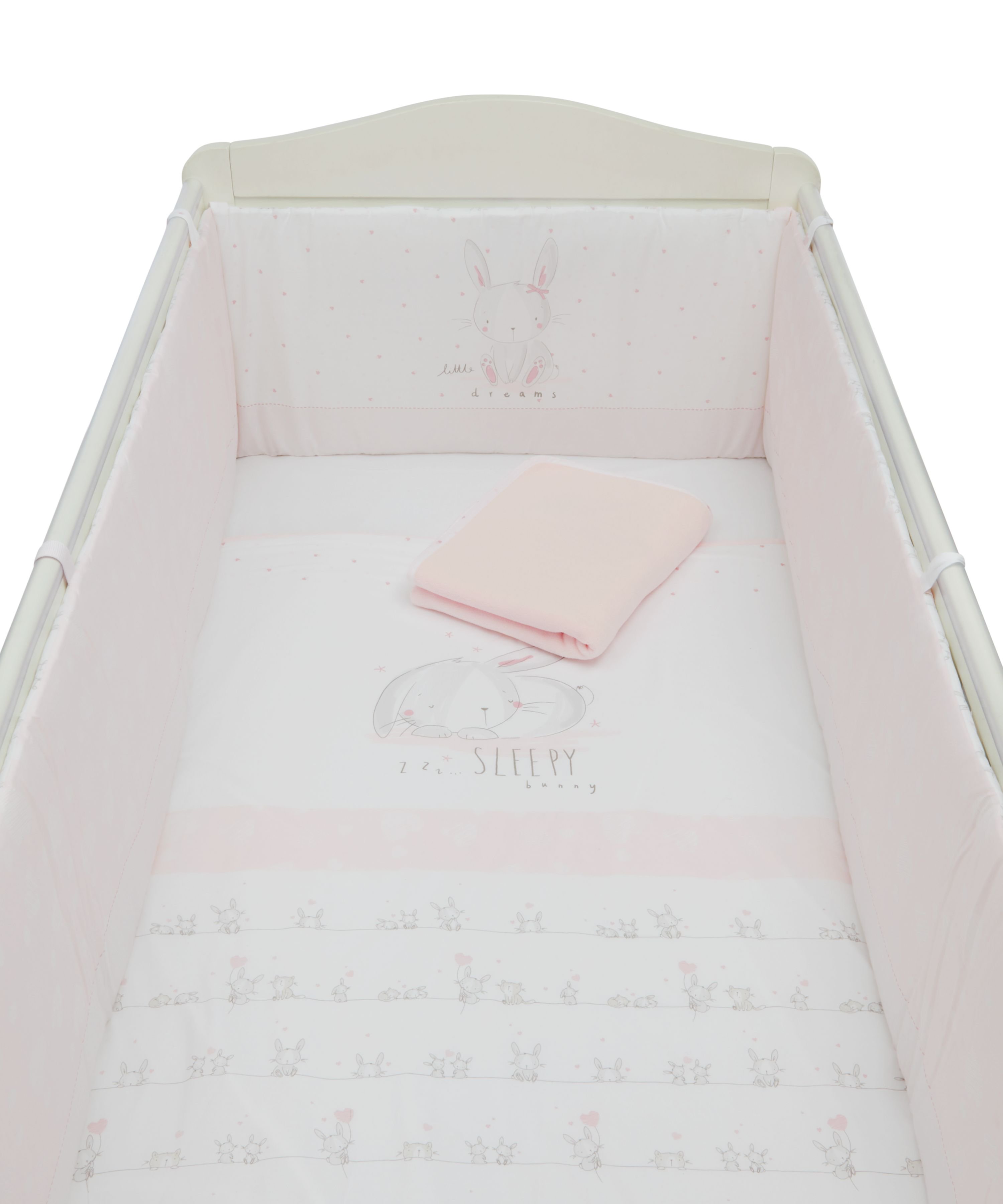 Нарядный набор постельного белья в детскую кроватку, выполненный в нежном розовом цвете. Состоит из удлиненного бампера на завязках, одеяла и флисового покрывала. Элементы набора украшены симпатичными зайчиками.