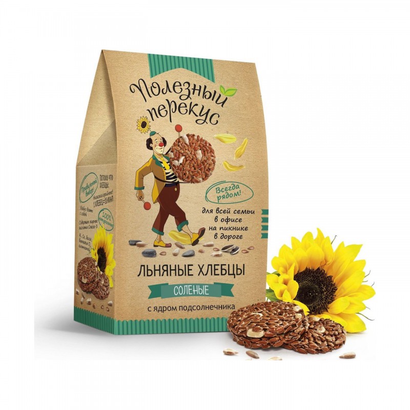 Льняные хлебцы – хрустящие снеки прямо с Алтайских полей! Помогут вам с пользой для здоровья утолить голод даже на ходу. Ведь льняное семя – это источник жирных Омега-3 кислот, клетчатки и растительного белка. Семена льна помогут настроить работу кишечника и тем самым нормализовать вес. Семена подсолнечника – насыщают организм калием, магнием, содержат витамин Е и необходимые аминокислоты. Сочетая пользу льняных и подсолнечных семечек, мы создали для Вас прекрасную альтернативу “”быстрой еде”” – абсолютно натуральные льняные хлебцы на любой день и для любой ситуации!