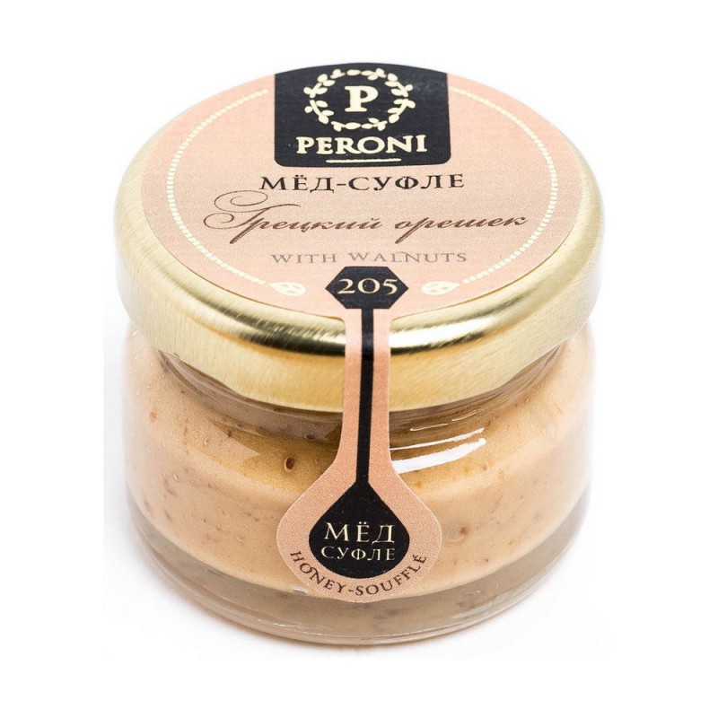 Мед-суфле “”Peroni”” с грецким орешком – это настоящее удовольствие с большой буквы. Здесь есть всё – тонкая сладость и аромат гречишного меда, обволакивающая горчинка грецких орехов и карамельная нежность суфле. Именно это сочетание является одной из самых любовных смесей – повышает потенцию, очень полезно как для женщин, так и для мужчин. Рекомендуется употреблять в день не более 50 грамм.