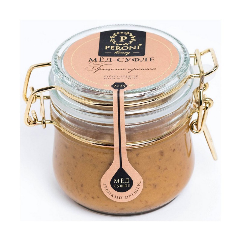 Мед-суфле “”Peroni”” с грецким орешком — это настоящее удовольствие с большой буквы. Здесь есть всё — тонкая сладость и аромат гречишного меда, обволакивающая горчинка грецких орехов и карамельная нежность суфле. Именно это сочетание является одной из самых любовных смесей — повышает потенцию, очень полезно как для женщин, так и для мужчин. Рекомендуется употреблять в день не более 50 грамм.