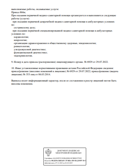 Проводит диагностику и лечение аритмии, атеросклероза, гипертонии, пороков сердца, сердечной недостаточности, тромбофлебита, тахикардии и других заболеваний сердечно-сосудистой системы. Также проводит восстановительное лечение после инфаркта.