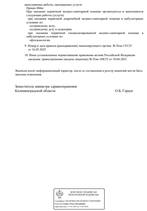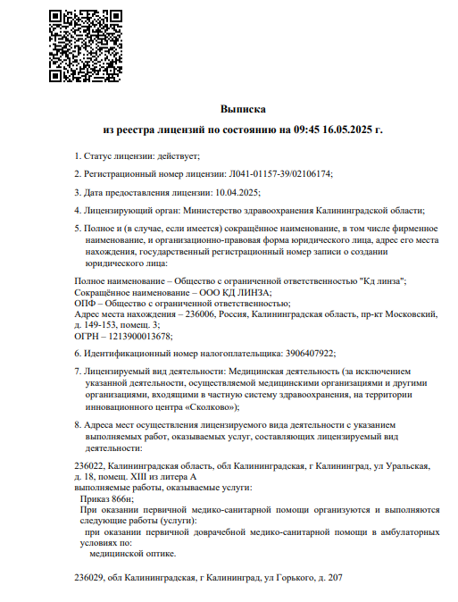 Проводит диагностику и лечение астигматизма, близорукости, дальнозоркости, конъюнктивит (вирусный, бактериальный, аллергический), косоглазия, ячменя. Занимается проверкой зрения, а также подбором очков и контактных линз.