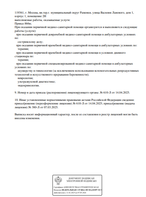 Многопрофильный медицинский центр. Осуществляет консультативный и диагностический прием взрослых и детей. В клинике работают специалисты по направлениям гастроэнтерологии, урологии, гинекологии, кардиологии, неврологии, терапии и т.д. Прием проводится по предварительной записи.