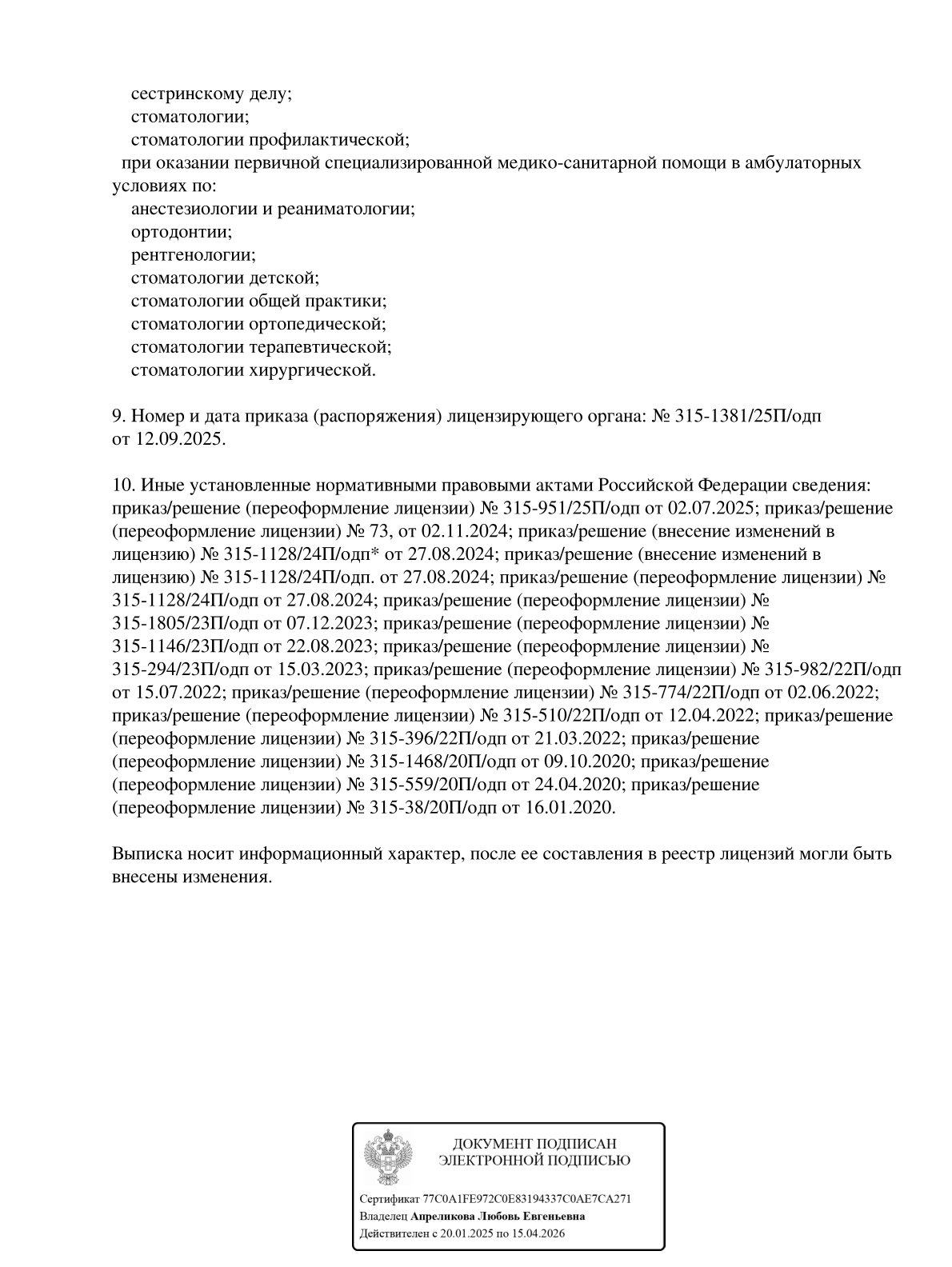 Проводит лечение кариеса, пульпита, пародонтита, отбеливание зубов, профгигиену полости рта, лечение аномалий прикуса на брекет системах, лечение на ранней брекет системе, лечение аномалии прикуса детей раннего возраста на съемных ортодонтических аппаратах, преортодонтическое лечение на каппах (системы Myobrace, Occlus-o-Guide), лечение на несъемных ортодонтических аппаратах.