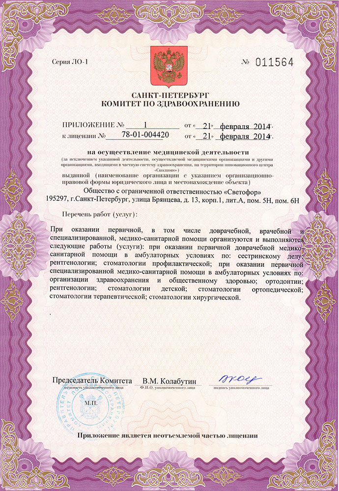 На базе детской стоматологии Светофор проводится профилактика (профессиональная гигиена полости рта, фтористая профилактика кариеса у детей, герметизация фиссур, покрытие фтор-лаком), лечения постоянных зубов и молочных зубов. Предлагается исправление прикуса. Прием проводится по предварительной записи.