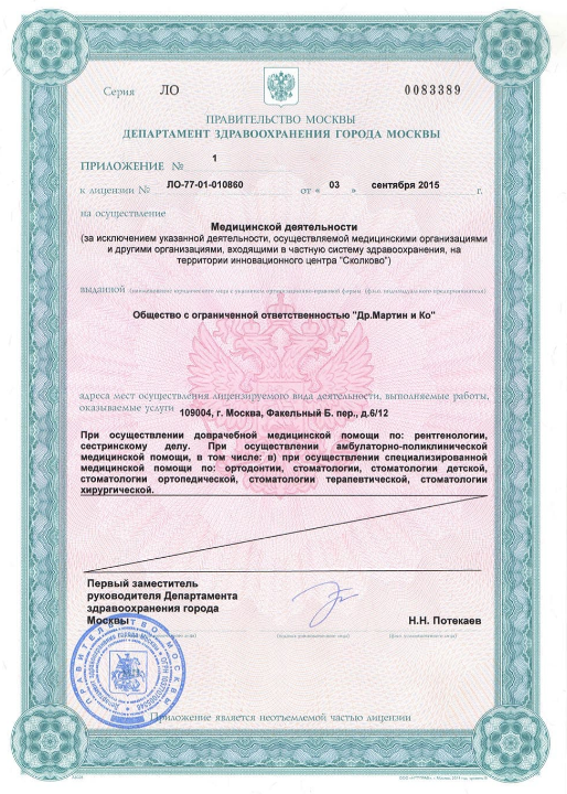 Предлагается исправление прикуса прозрачными, металлическими, комбинированными брекет-системами, ортодонтическое лечение с помощью трейнеров, элайнеров. Оказываются услуги в области эстетической стоматологии: отбеливание, исправление сколов, пятен, трещин зубов с помощью виниров, композитных материалов. Работает отделение имплантации и хирургии.