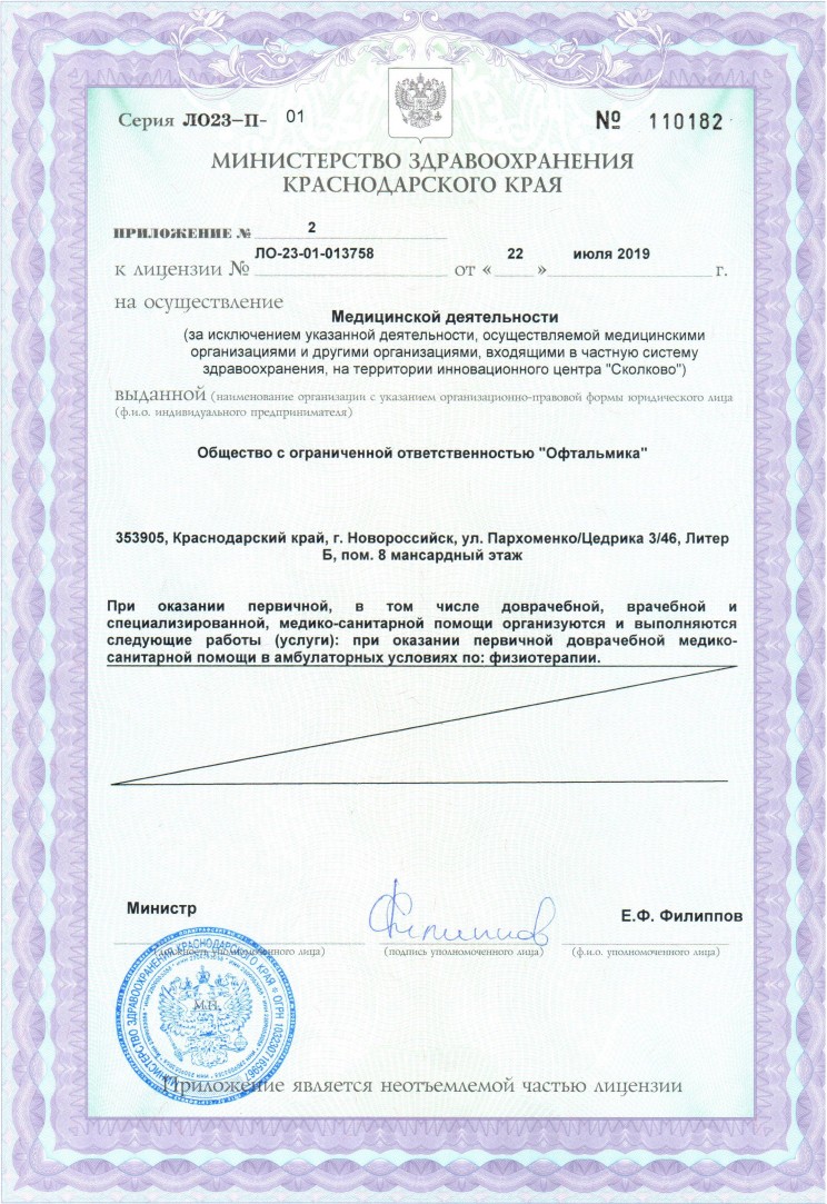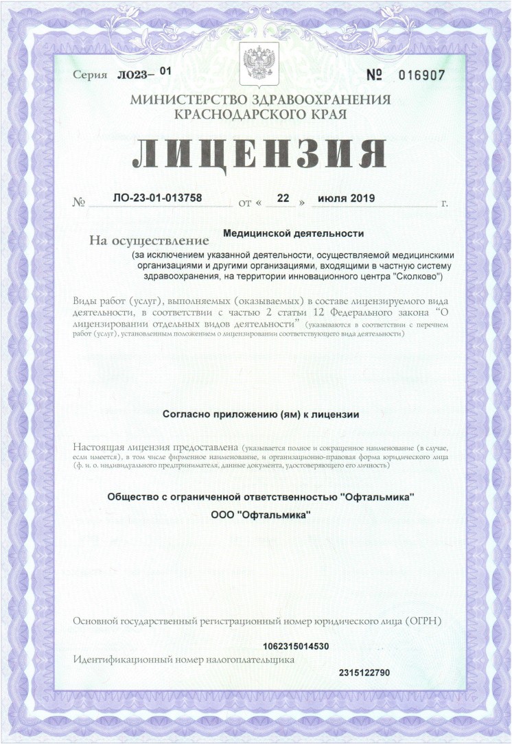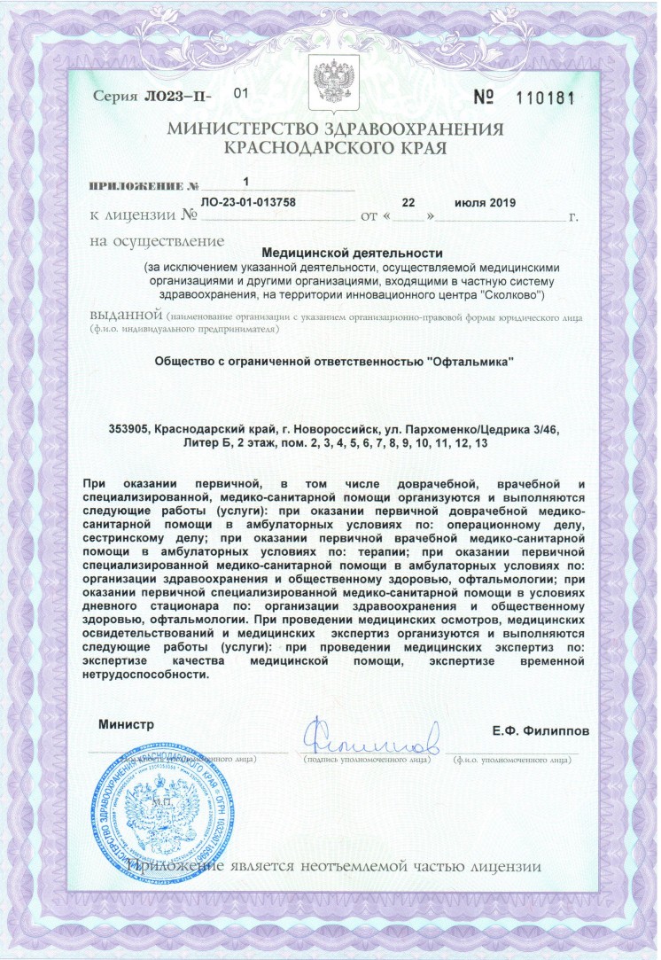 В глазной клинике «Офтальмика» осуществляется высокоточная диагностика широкого круга заболеваний. Для их выявления применяются следующие методы: автокераторефрактометрия, визометрия, оптическая когерентная томография сетчатки, тонометрия, периметрия, гониоскопия, осмотр с линзой Гольдмана и биомикроскопия. Здесь лечатся такие заболевания, как близорукость, дальнозоркость, астигматизм, косоглазие, диабетическая ретинопатия и патологии сетчатки, глаукома, также проводятся операции по удалению катаракты. В клинике можно подобрать линзы и очки, а также получить лазерное хирургическое лечение заболеваний сетчатки.
