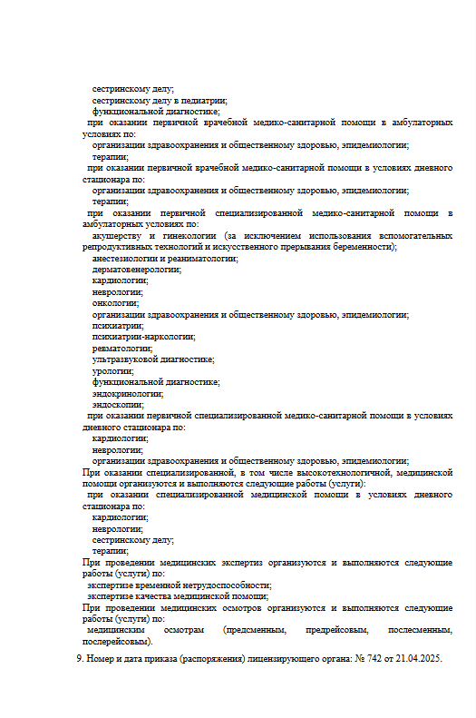 , Ревматология – диагностика и лечение заболеваний суставов, УЗИ – широкий спектр исследований, Дерматовенерология – лечение кожных заболеваний, Массаж – лечебные и профилактические программы, Кардиология – диагностика и лечение сердечно-сосудистых заболеваний, Неврология – лечение головных болей, мигрени, заболеваний нервной системы, Онкология (маммолог) – диагностика и контроль здоровья груди, Терапия – первичная диагностика и лечение заболеваний, Урология – здоровье мочеполовой системы, Эндокринология – лечение диабета и гормональных нарушений, Функциональная диагностика – ЭКГ, СМАД, холтер, Дневной стационар – лечение под наблюдением