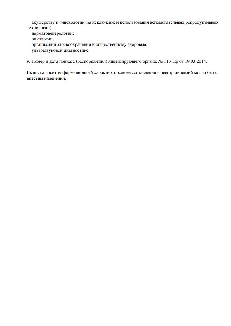 На базе Клиники дерматологии и косметологии проводятся услуги в области дерматологии (диагностика и удаление бородавок, родинок, стержневых мозолей, пигментных образований, удаление доброкачественных образований, удаление контагиозного моллюска, удаление милиумов, удаление гемангиом), гинекологии (введение ВМС, лечение патологии шейки матки радиоволновым методом, удаление кондилом урогенитальной зоны, прижигание кист на шейке матки, манипуляция по удалению инородных тел из влагалища, забор биологического материала для исследования). Предлагается УЗИ: исследование органов малого таза, мочеполовой системы у женщин, органов мочеполовой системы у мужчин, органов мочевыделительной системы, органов брюшной полости, лимфатических узлов, щитовидной железы.