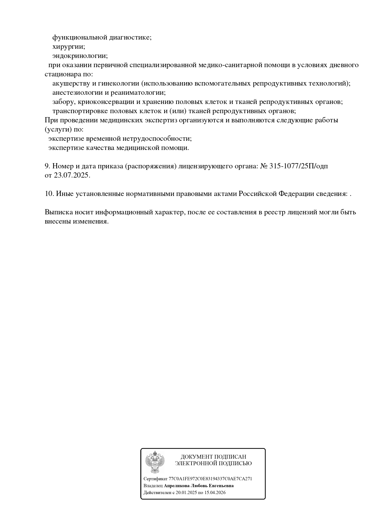 Проводит кольпоскопия, занимается радиоволновой хирургией. Проводит диагностику и лечение таких заболеваний, как воспалительные заболевания органов малого таза, доброкачественные заболевания тела и шейки матки, кисты и доброкачественные опухоли яичников.