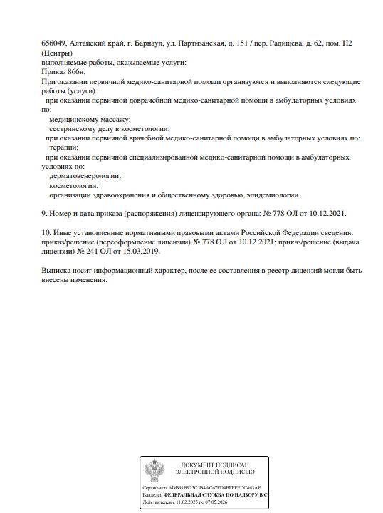Проводит диагностику и лечение дерматологических кожных заболеваний, в том числе акне, дерматозы, дерматиты, лишай, эритемы и др., а также удаление доброкачественных образований кожи, косметологические процедуры.