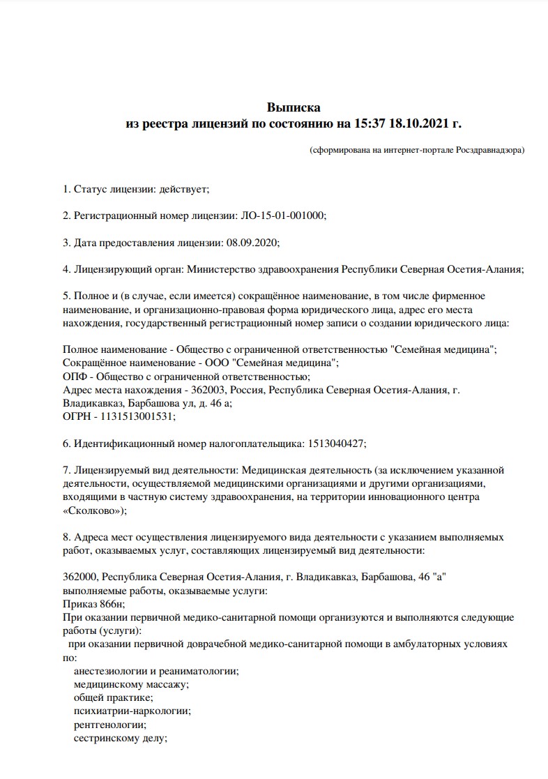Семейная медицина - это многопрофильная поликлиника во Владикавказе. В клинике оказывается помощь пациентам всех возрастов. Представлен полный набор врачебных специальностей, лабораторная диагностика, УЗИ, эндоскопия, функциональная диагностика.
