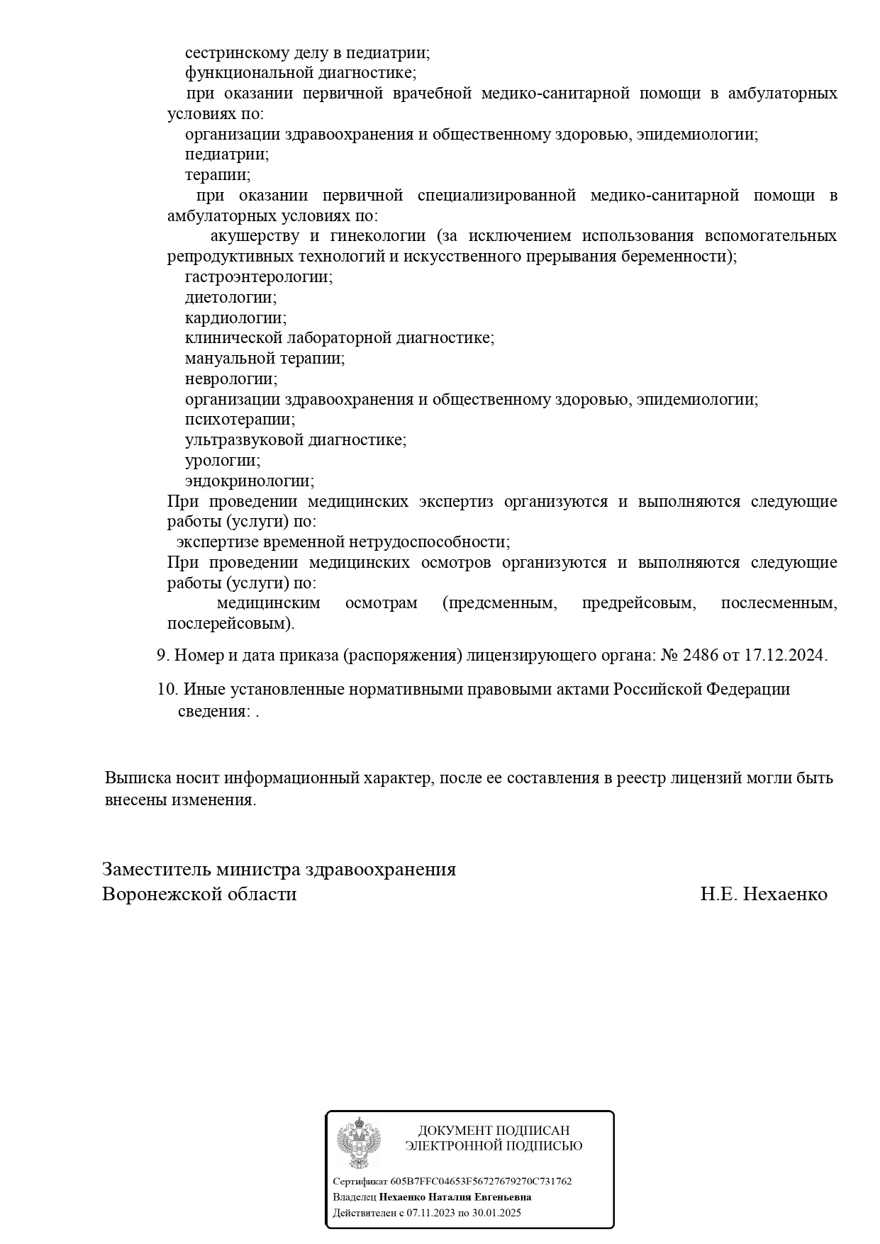 Занимается диагностикой, профилактикой и лечением гипертонии, пороков сердца, сердечной недостаточности, тромбофлебита, тахикардии, аритмии, атеросклероза и др. Также проводит восстановительное лечение после инфаркта. Проводит исследования пациентам всех возрастов, эхокардиографию (ЭхоКГ), электрокардиографию (ЭКГ), триплекс БЦА, холтеровское мониторирование ЭКГ.