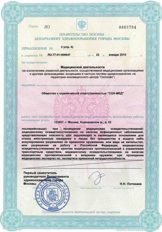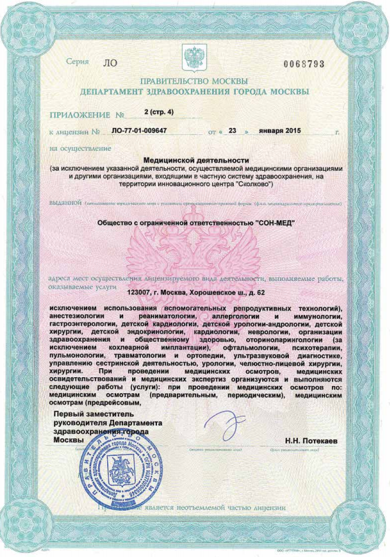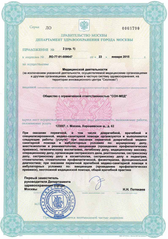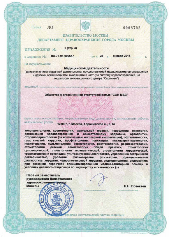 В клинике Медлайн-Сервис на Хорошёвском шоссе принимают врачи, с большим опытом, среди которых кандидаты наук, врачи высшей категории. Принимаем взрослых и детей с рождения. Для установления точного диагноза есть возможность пройти диагностику: УЗИ, ДС (дуплексное сканирование), 3D УЗИ, 4D УЗИ, гастроскопию, ЭХОКГ, рентген, спирометрию, суточное мониторирование АД, Суточное ЭКГ мониторирование (по Холтеру), ЭКГ, ЭЭГ, гистероскопию, колоноскопию, кольпоскопию, ректороманоскопию, цистоскопию, эзофагогастродуоденоскопия (ЭФГДС). А также, при необходимости, пройти лабораторную диагностику - анализы крови, мочи и других биоматериалов. В стоматологическом отделении есть отдельный рентген-кабинет, где также установлен ортопантомограф. Для удобства наших пациентов врачи могут выехать на дом к пациенту. Также доступны услуги медицинской сестры на дому, лабораторная диагностика и даже УЗИ на дому.