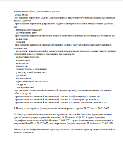 Медицинский центр Доктор Вера осуществляет консультативный и диагностический прием взрослых и детей. В центре прием клиентов ведется по таким направлениям, как реабилитация после COVID-19, урология, физиоотделение, УЗИ исследования, кардиография, биопсия, терапия, хирургия, эндокринология, дерматология, гинекология, онкология, маммология, психология, ортопедия, медицинские анализы.