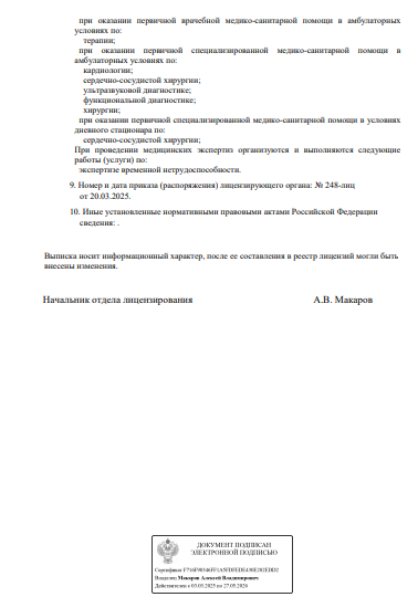Проводит диагностику, профилактику и лечение таких заболеваний сердечно-сосудистой системы, как аритмия, тахикардия, тромбофлебит, атеросклероз, гипертония, порок сердца, сердечная недостаточность, а также восстановительное лечение после инфаркта.