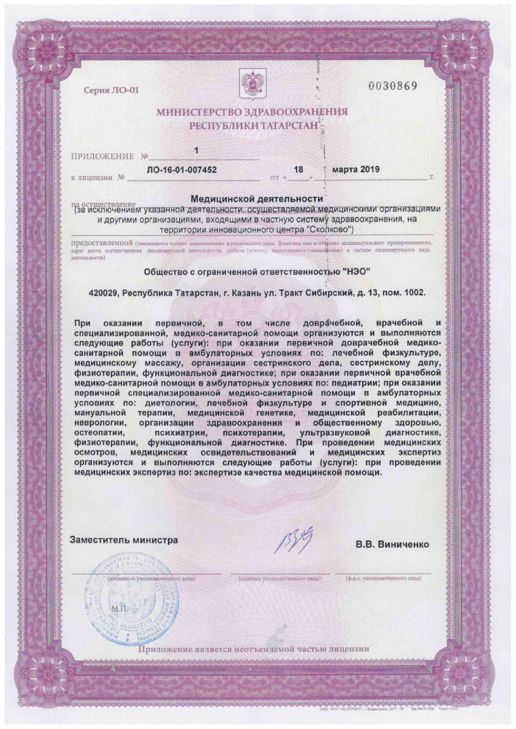 Медицинский центр НЭО оказывает специализированную неврологическую помощь детям и взрослым. В центре принимают ведущие детские неврологи, детские и взрослые остеопаты, взрослые неврологи, детские и взрослые эпилептологи, психиатры, психотерапевты. В основе лечения лежит комплексный подход к ребёнку с неврологическим заболеванием. Для помощи детям с неврологическими заболеваниями в медицинском центре применяются: медикаментозное лечение, методы мануальной медицины (лечение руками), психолого-педагогический подход, восстанавливающие занятия с применением аппаратов и компьютерных программ. В клинике НЭО используются современные методы диагностики на оборудовании высшего класса: УЗИ исследования мозга и сосудов мозга, ЭЭГ, видео –ЭЭГ-мониторинг. Диагностику и лечение пациентов осуществляют врачи высшей категории, доценты и профессора кафедры детской неврологии казанской государственной медицинской академии.