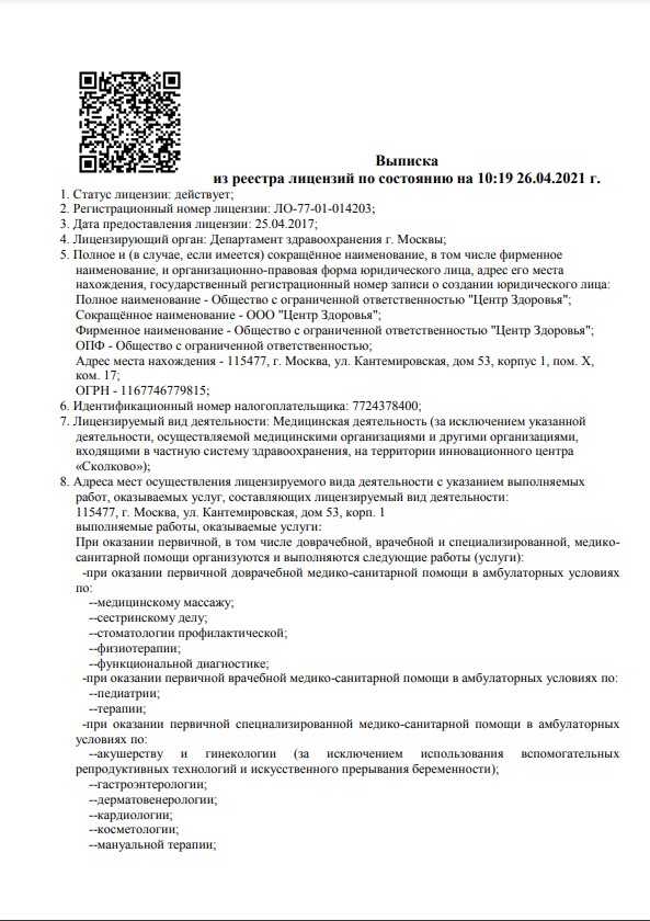 Многопрофильная клиника Трит оказывает медицинские услуги по многим направлениям: терапия, неврология, гинекология, дерматовенерология, психотерапия и т.д. Для оперативного решения вопросов первичной диагностики клиника оборудована собственной лабораторией, а также точным диагностическим оборудованием для проведения эндоскопии, колоноскопии, ультразвукового исследования, рентгена, МРТ. Условия выданной медицинской лицензии предоставляют многопрофильной клинике Трит право выдавать различные медицинские документы, требуемые при трудоустройстве и других жизненных обстоятельствах. В их числе – медицинская книжка, справка о состоянии здоровья, заключение медкомиссии и так далее.