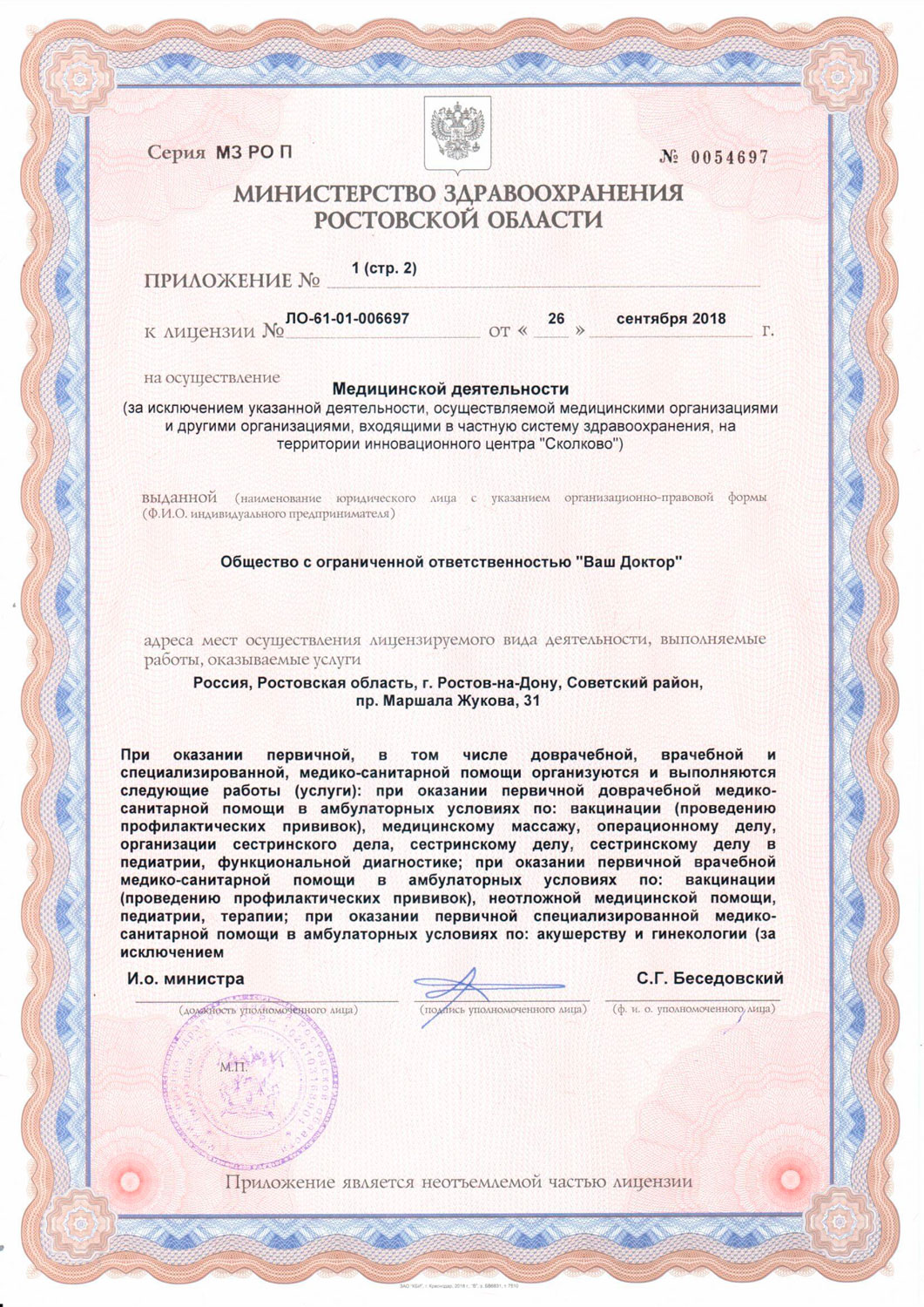 В медицинском центре Ваш Доктор на Жукова проводится лечебно-консультативный прием по таким направлениям, как гинекология, кардиология, неврология, ортопедия, офтальмология, оториноларингология, педиатрия, хирургия, урология, эндокринология и терапия. В клинике проводятся следующие виды диагностических операций: ЭКГ, холтеровское мониторирование сердечного ритма, допплерография, нейросонография, ЭхоКГ и УЗИ внутренних органов.