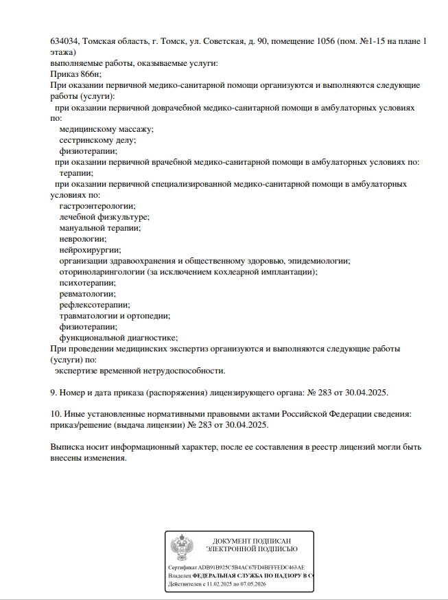 Занимается физиотерапевтическим лечением, проводит магнитотерапию, амплипульстерапию, электротерапию, ультразвуковую терапию, лазеротерапию, оздоровительные и косметологические процедуры.