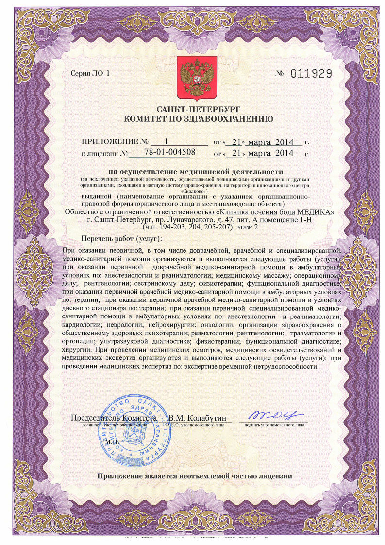 Занимается лечением следующих заболеваний: боль в спине и шее, посттравматическая (послеоперационная) боль, невралгии, моно- и полинейропатии (постгерпетические, диабетические), мышечная боль, боль на фоне онкологических заболеваний, боль неясного происхождения, реабилитация после хирургического лечения.